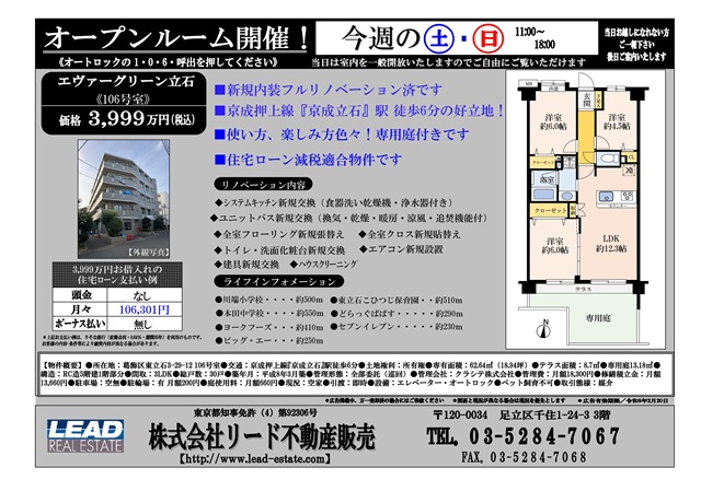 【オープンルーム開催!】 ◆日時:日時:2/7(土)・8(日) 11時~18時 ◆所在:葛飾区東立石3-29-12 エヴァーグリーン106号室 ◆交通:京成押上線『京成立石』駅 徒歩6分 ◆価格:3,999万円(税込) ◆間取:3LDK