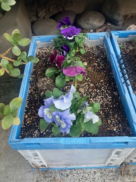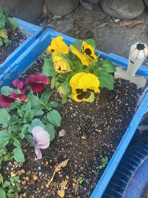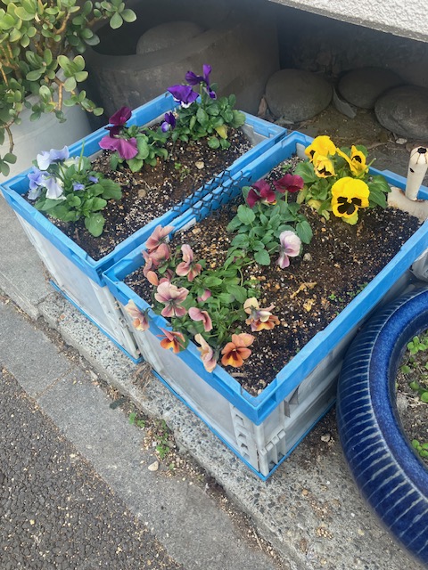パンジーの下にはチューリップの球根を植え込みましたのでパンジーの終わる頃にはチューリップが顔を出す仕組みです。 楽しみですね。児玉